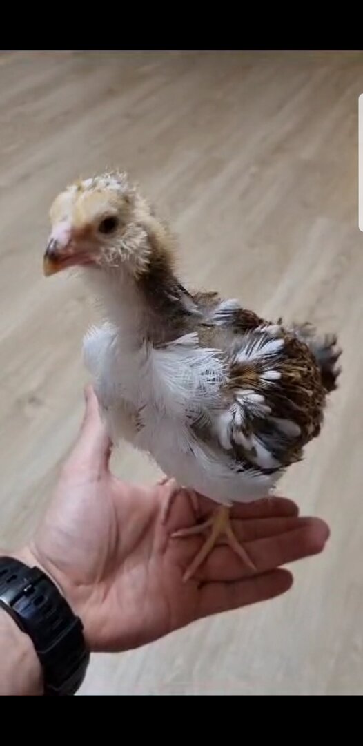 Это обычный цыплёнок из домашнего инкубатора. Просто первый. Дети решили оставить. Поэтому ест, как все. Первое время вареные яйца, потом вареное пшено, теперь подрос, ест как все куры.