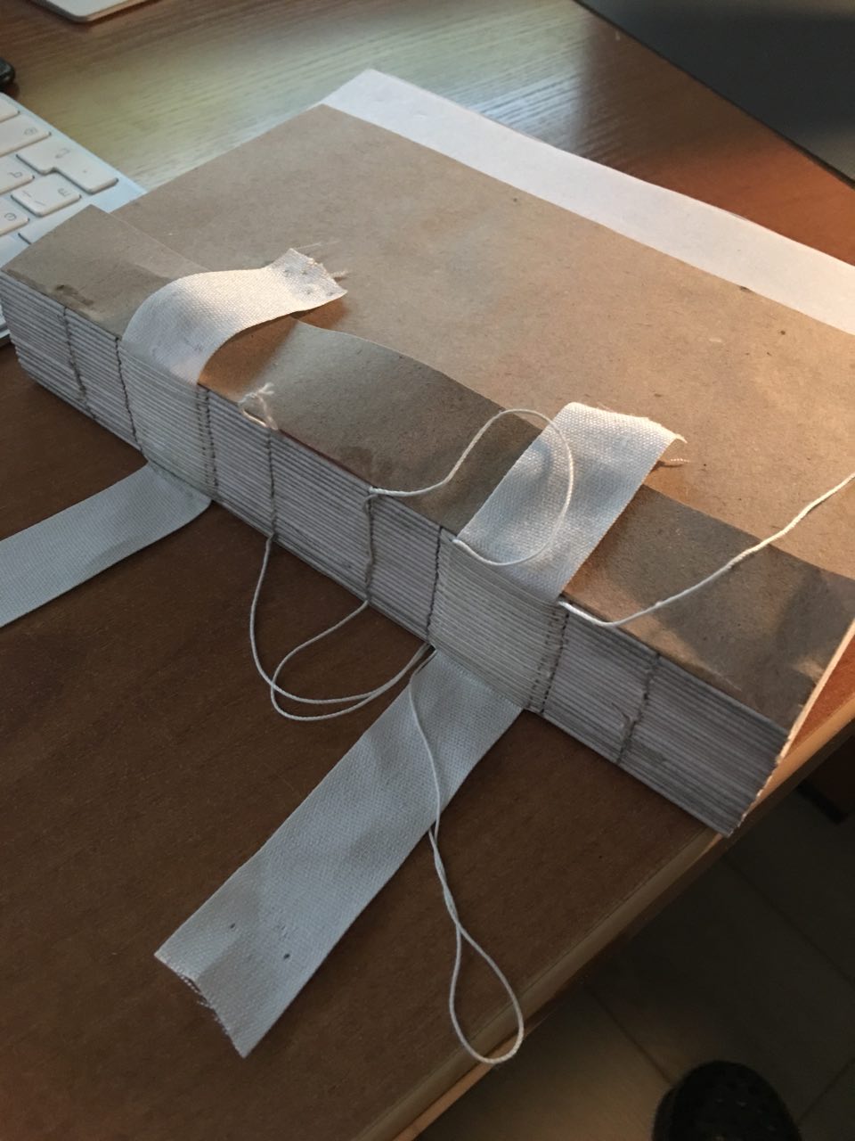 Вообще-то я делаю сразу три, фотографирую только самое первое, второе сшито не на нити, а на ленты, и оно будет с отвергнутой обложкой. На третьем пробуем другую бумагу, более белую.