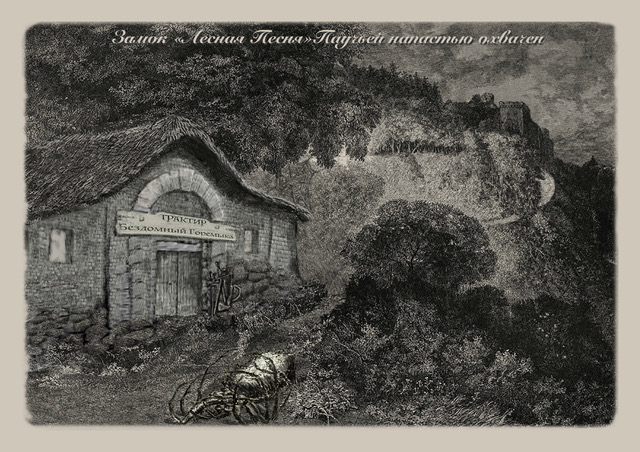 ...У подножия, рядом с дорожкой, разместилась небольшая, но крепкая постройка, сложенная из дикого камня. Квадратные окна приглушенно светятся. Над дверью полукруглая надпись «Трактир Бездомный Горемыка». У входа беспорядочно составлены несколько щитов, топоров и мечей. Рядом лежит огромный мертвый паук. По верху почтовой открытки бежит причудливая надпись: «Замок Лесная Песня. Паучьей напастью охвачен».
